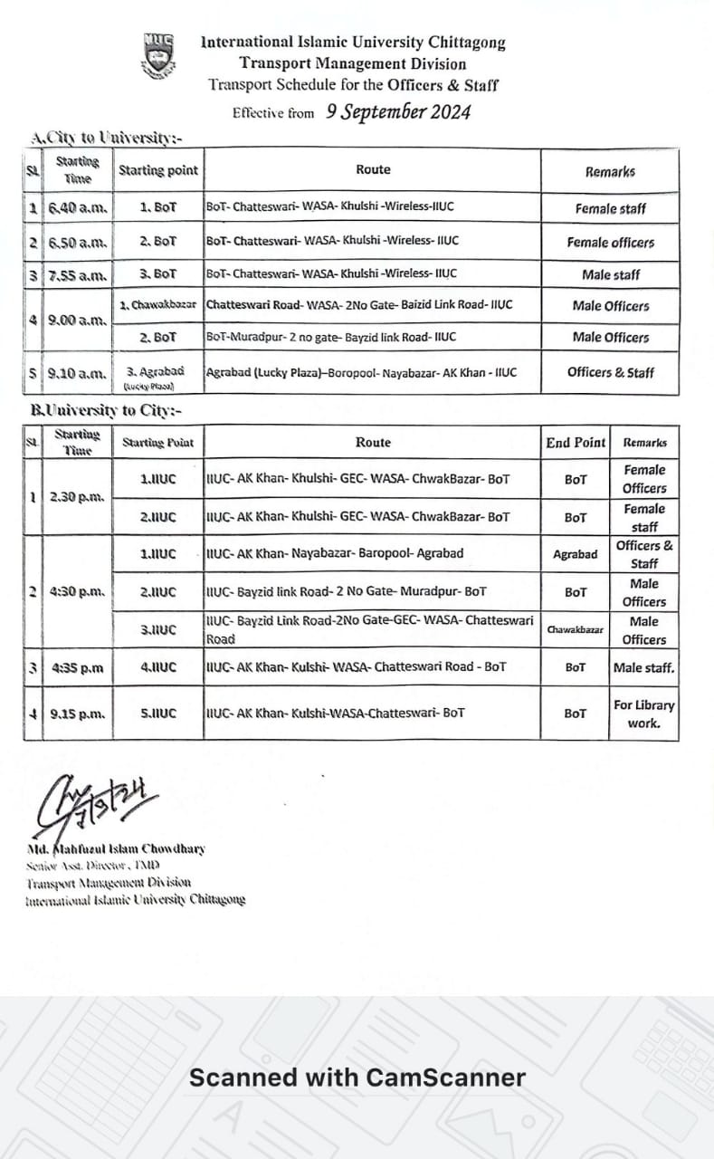 Transport Schedule for the Officers and Staff Effective from 09th September, 2024